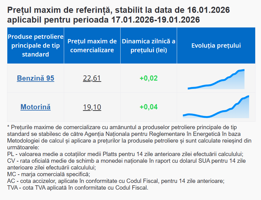 Agenția Națională pentru Reglementare în Energetică informează despre faptul că a treia săptămână din ianuarie 2026 se finalizează cu scumpirea prețului de comercializare a benzinei și motorinei.