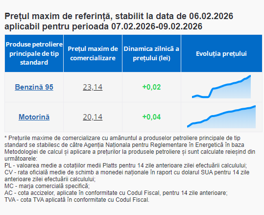 Agenția Națională pentru Reglementare în Energetică (ANRE) a stabilit prețurile maxime de referință pentru principalele produse petroliere de tip standard, aplicabile în perioada 7-9 februarie 2026.