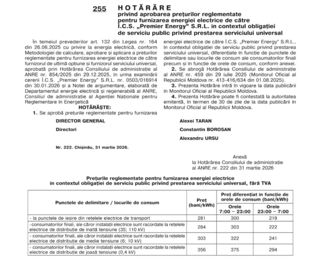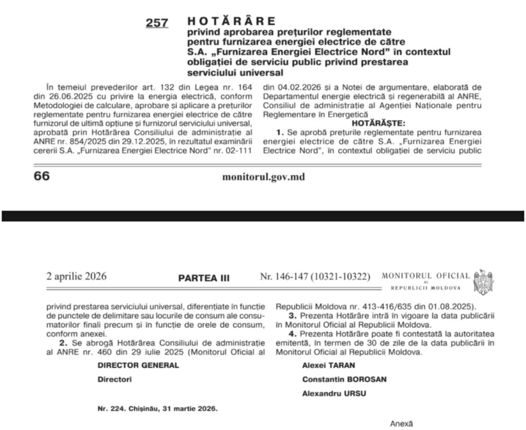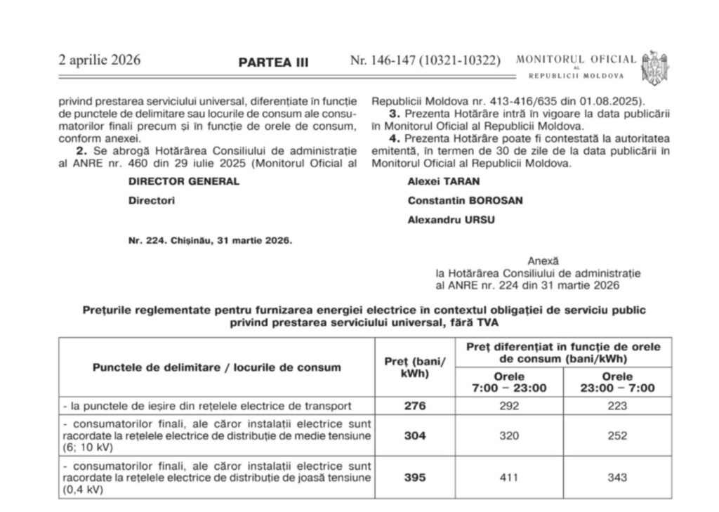 Energia electrică se ieftinește pentru consumatori. Noile tarife au intrat în vigoare astăzi, odată cu publicarea deciziilor Agenției Naționale pentru Reglementare în Energetică (ANRE) în Monitorul Oficial, transmite MOLDPRES.