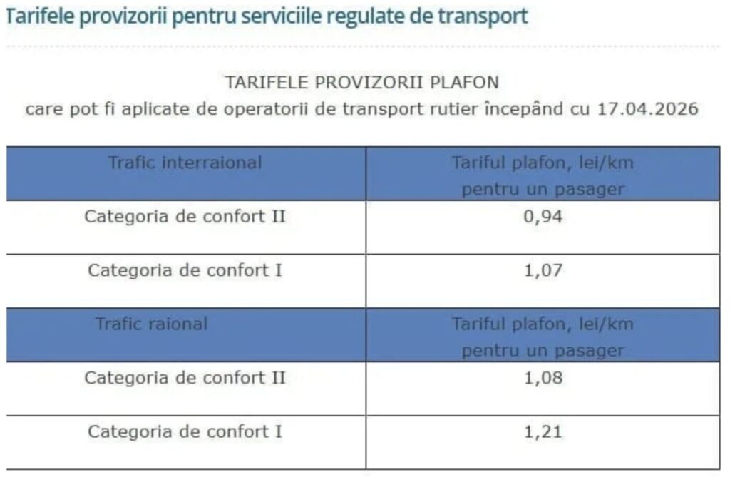 În traficul raional, costurile maxime au fost fixate la 1,08 lei pe kilometru pentru categoria a doua de confort și la 1,21 lei pe kilometru pentru categoria întâi.