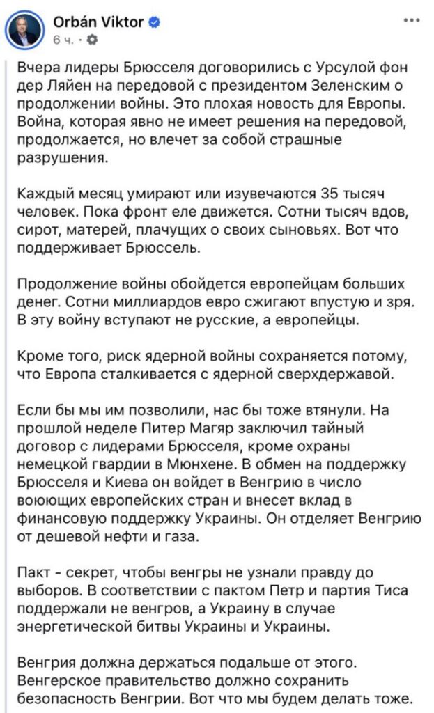 Premierul Ungariei, Viktor Orban, a declarat că liderii de la Bruxelles, conduși de președinta Comisiei Europene, Ursula von der Leyen, au convenit cu președintele ucrainean Volodimir Zelenski asupra continuării războiului din Ucraina. Afirmațiile au fost făcute într-un mesaj publicat miercuri pe Facebook și sunt citate de LiberNews.md.